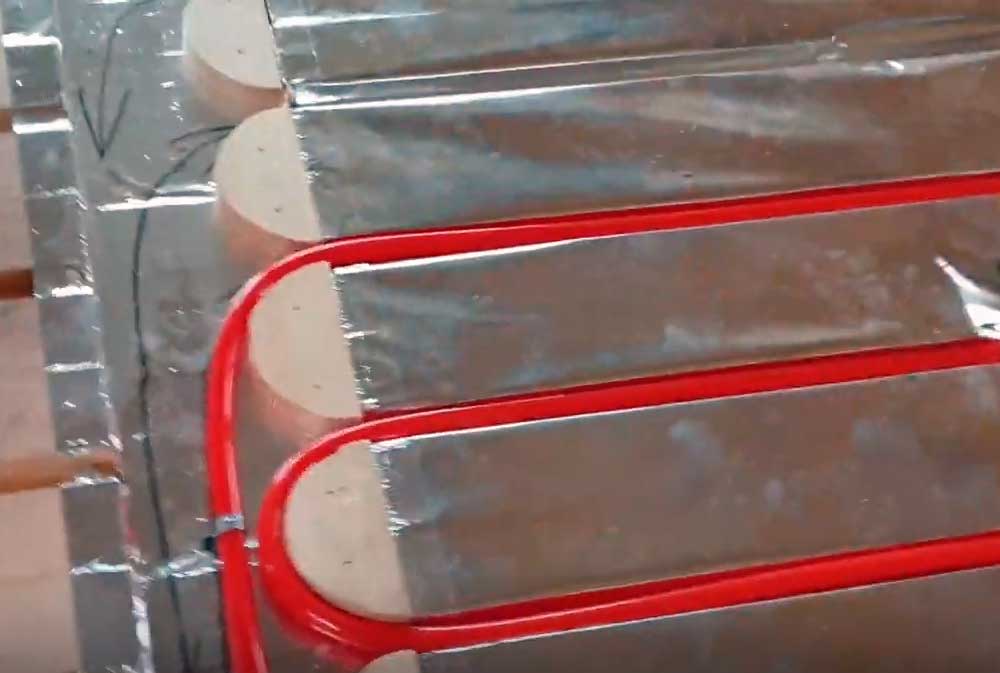 Далее, по месту укладки труб монтируется металлизированный скотч. Это необходимо для того, что бы увеличить теплоотдачу и снизить энергозатраты в доме.